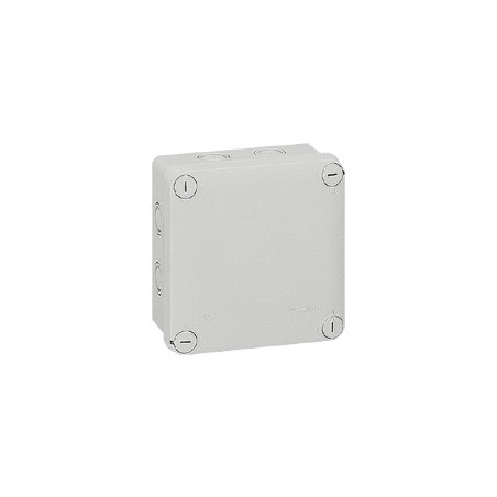 Description: Boite de derivation carree Plexo IP 55 - etanche - gris RAL 7035 - 7 entrees pour PE ISO 1620 - fermeture du couvercle par 14 de tour - dimensions 105x105x55 mm