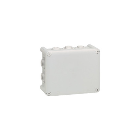 Description: Boite de derivation rectangulaire PLEXO IP 55 - etanche - avec couvercle fermeture par 14 de tour - gris RAL 7035 - 10 embouts - dimension 180 x 140 x 86 mm