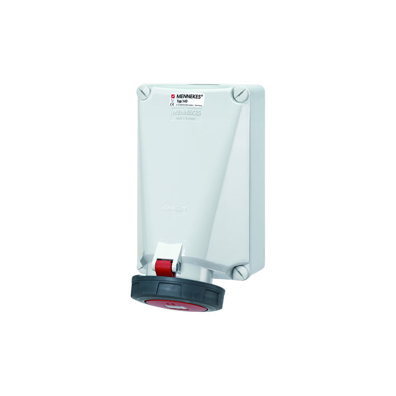 PRISE MURAL CEE 125A 5P 6H 400V IP67.BORNES À VIS.ENVELOPPE GRIS CLAIR AVEC FIXATIONS INTÉRIEURES.COUVERCLE À CHARNIÈRE AVEC COULEUR DIDENTIFICATION ROUGE.