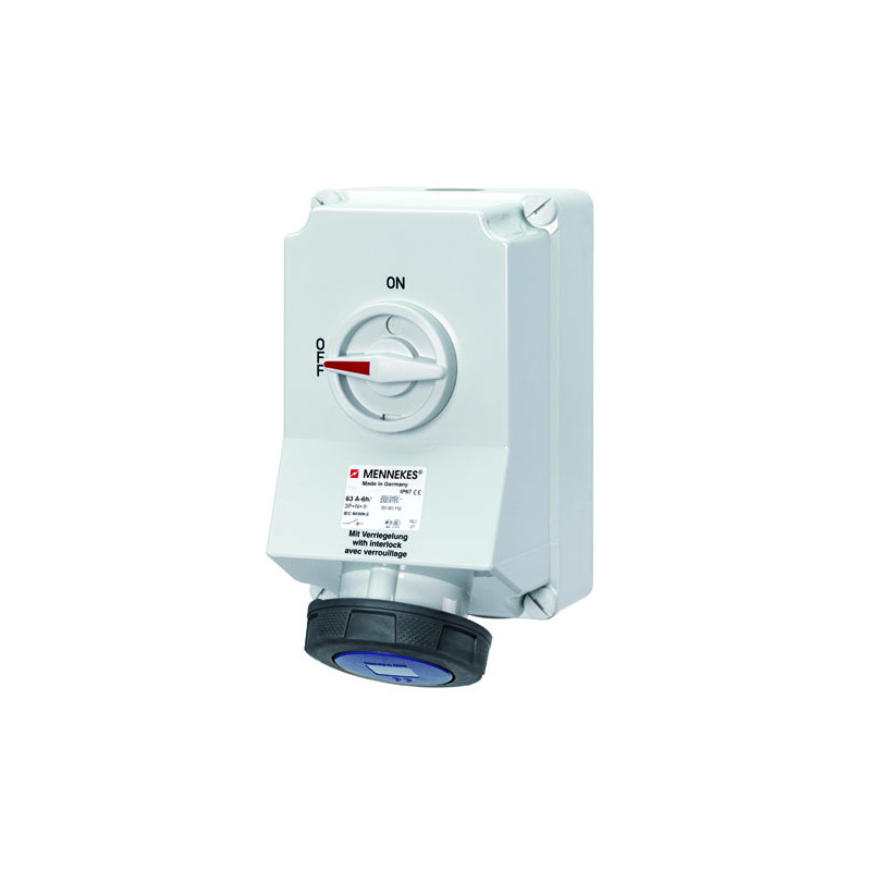 PRISE MURAL CEE 63A 4P 9H 230V IP67, AVEC INTERRUPTEUR ON/OFF.ET VERROUILLAGE MÉCANIQUE DUO.
