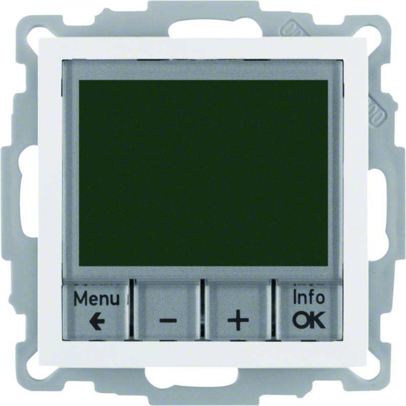 Marque: Berker by HagerRéférence: 20448989EAN: 4011334354703Emballage: 1Description: Thermostat programmable, contact NO, S.1 blanc polaire, brillant