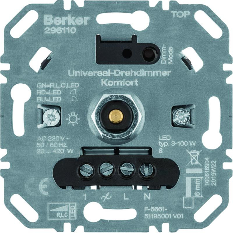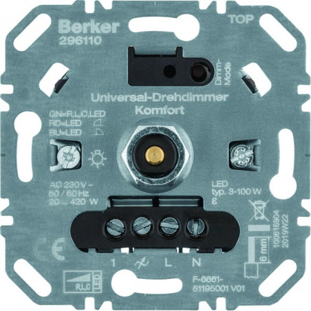 Marque: Berker by HagerRéférence: 296110EAN: 4011334510147Emballage: 1Description: Variateur rotatif uni confort R,L,C,LED