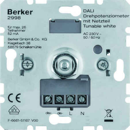 Marque: Berker by HagerRéférence: 2998EAN: 4011334510093Emballage: 1Description: Variateur rotatif DALI sans alimentation à associer à 2997