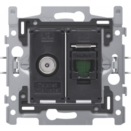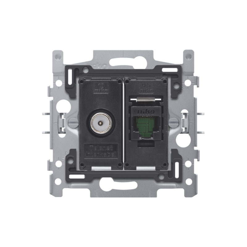 Description: COMBINAISON COAX AVEC CONNEXION RJ45 UTP CAT. 5E, MODELE PLAT, INCL. SOCLE 60 X 71 MM AVEC FIXATION PAR GRIFFES, AGREATION WYRE (TELENET-INTERKABEL) ET VOO
