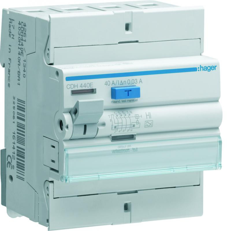 Marque: HagerRéférence: CDH440EEAN: 3250611614128Emballage: 1Description: Interrupteur différentiel 4P 40A 30mA type HI 4MOD.