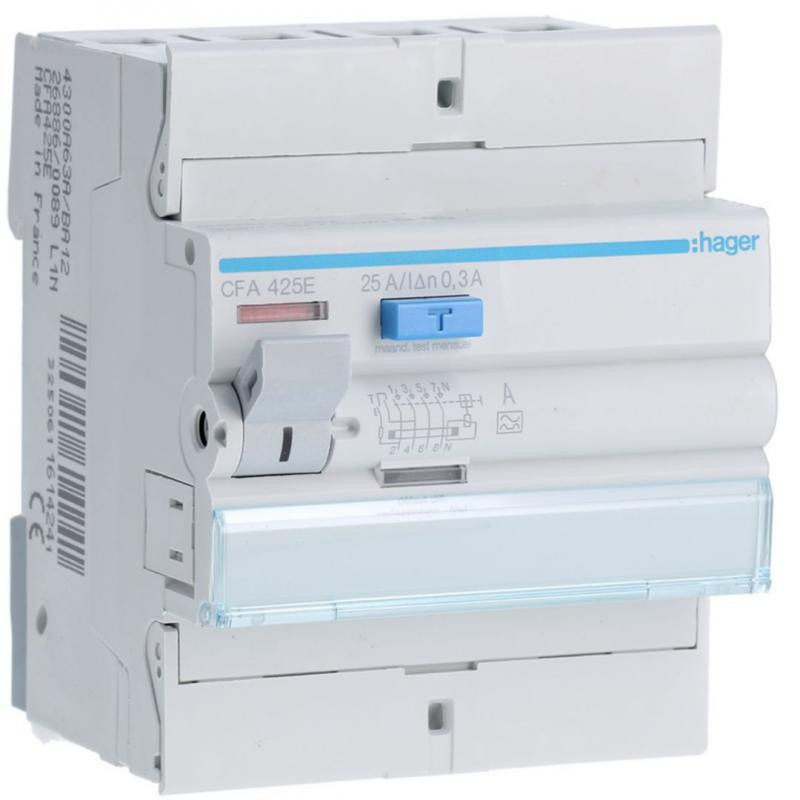 Marque: HagerRéférence: CFA425EEAN: 3250611614241Emballage: 1Description: Interrupteur différentiel 4P 25A 300mA type A 4MOD.