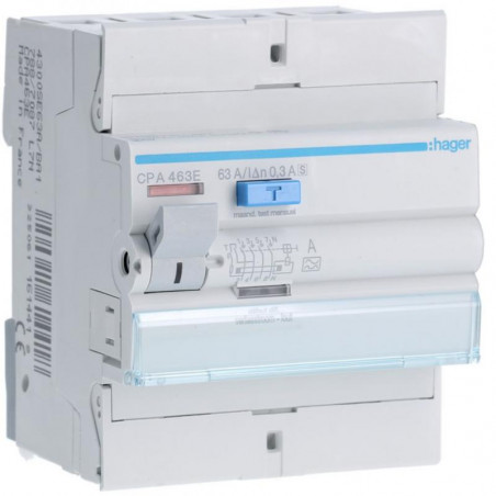 Marque: HagerRéférence: CPA463EEAN: 3250611614418Emballage: 1Description: Interrupteur différentiel 4P 63A 300mA type A S 4MOD.