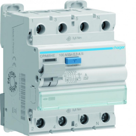Interrupteur différentiel. 3PN 100A 300mA A S 4MOD.