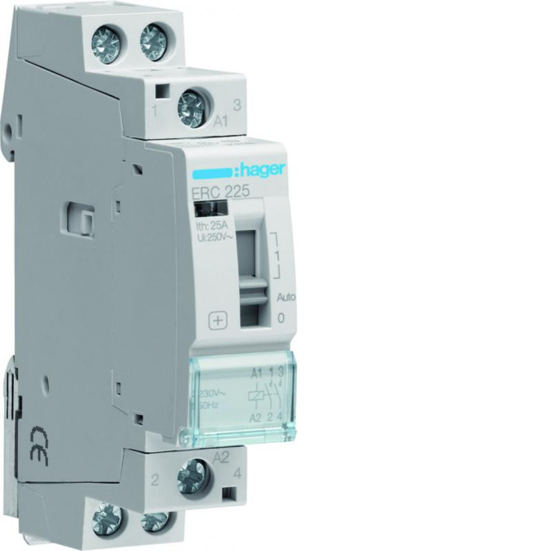 Marque: HagerRéférence: ERC225EAN: 3250612400676Emballage: 12/12Description: Contacteur commande manuelle 2x25A 230V 2NO 1MOD.
