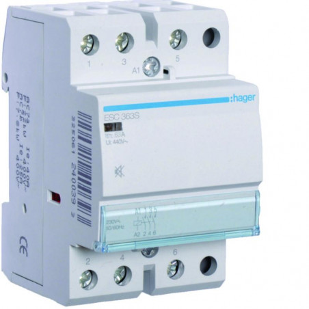 Marque: HagerRéférence: ESC363SEAN: 3250612400386Emballage: 1Description: Contacteur silencieux 3x63A 230V 3NO 3MOD.
