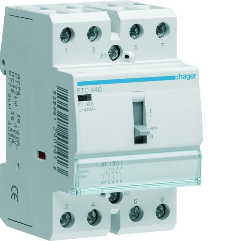 Marque: HagerRéférence: ETC440EAN: 3250612401413Emballage: 1Description: Contacteur J/N 4x40A 230V 4NO 3MOD.