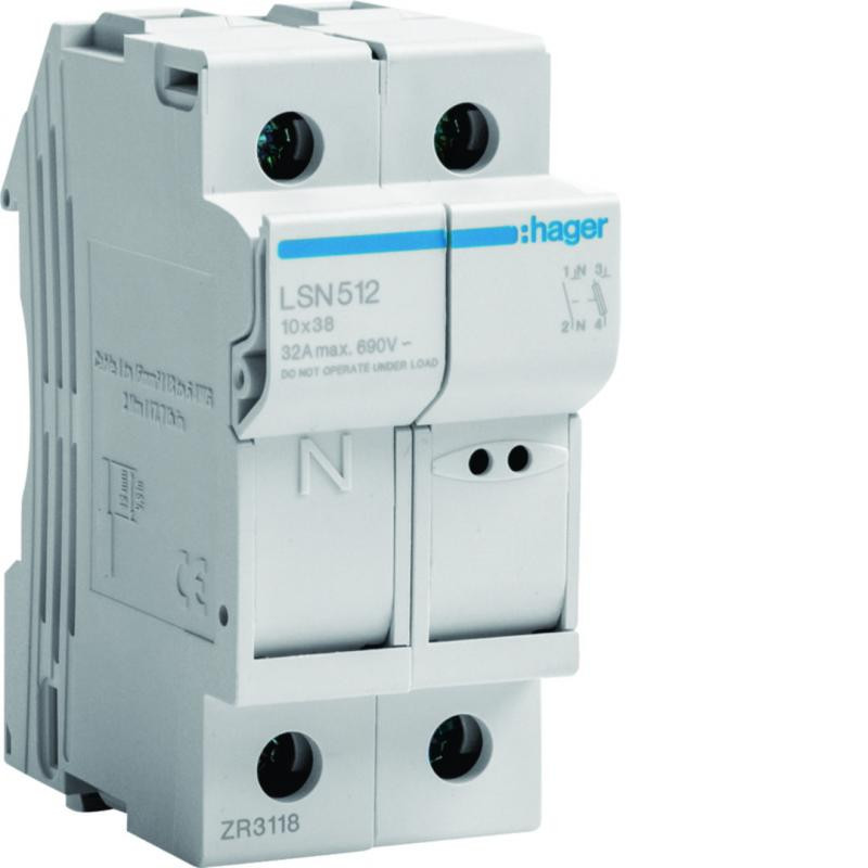 Marque: HagerRéférence: LSN512EAN: 3250614120121Emballage: 6/6Description: Coupe-circuit 10x38 - 1PN - 2M.