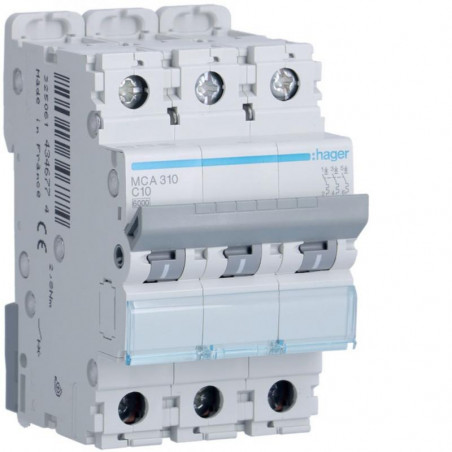 Marque: HagerRéférence: MCA310EAN: 3250614346774Emballage: 4/4Description: Disjoncteur 6kA - C - 3P - 10A - 3MOD.