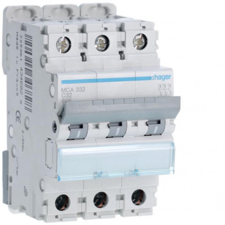 Marque: HagerRéférence: MCA332EAN: 3250614346828Emballage: 4/4Description: Disjoncteur 6kA - C - 3P - 32A - 3MOD.