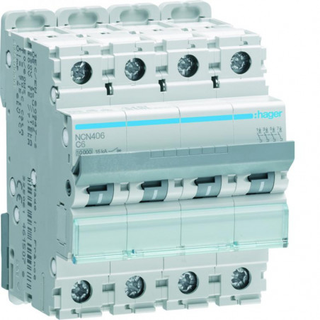 Marque: HagerRéférence: NCN406EAN: 3250614615047Emballage: 3/3Description: Disjoncteur 10kA - C - 4P - 6A - 4MOD.