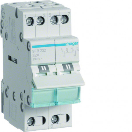 Marque: HagerRéférence: SFB232EAN: 3250615510884Emballage: 1Description: Inverseur modulaire 2 ples 32A, point commun aval, I-0-II