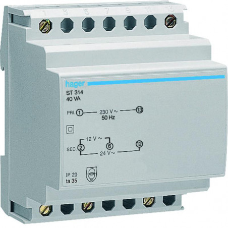 Marque: HagerRéférence: ST314EAN: 3250615703149Emballage: 1Description: Transformateur 220V/12-24V 40VA 4MOD.