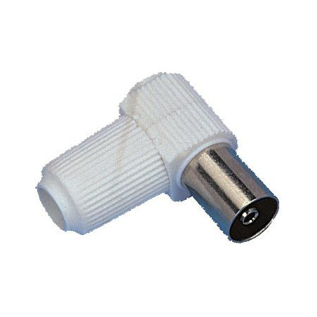 Description: Prise coaxiale femelle 9,5mm - Coudée 90° - A visser - Plastique
