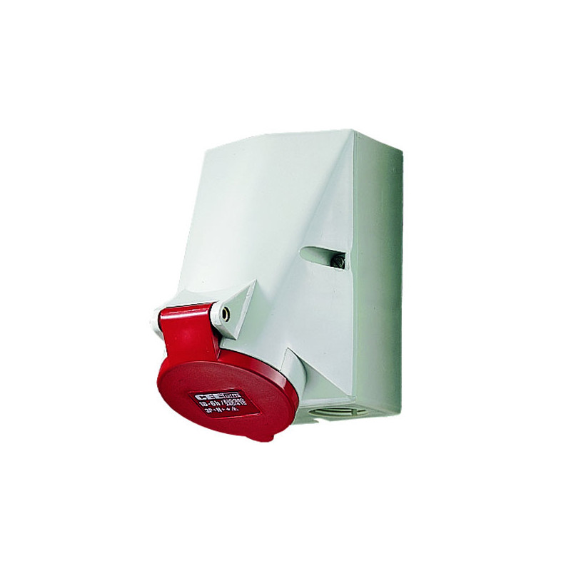 PRISE MURAL CEE 16A 5P 6H 400V IP44.AVEC BORNES A VIS.CONTACTS NICKELES DANS UN SUPPORT DE CONTACTS A HAUTE RESISTANCE THERMIQUE.ENVELOPPE GRIS CLAIR AVEC FIXATIONS INTERIEURES.L'EMBASE DE L'ENVELOPPE EST ROTATIF A 180 .COUVERCLE A CHARNIERE AVEC COULEUR