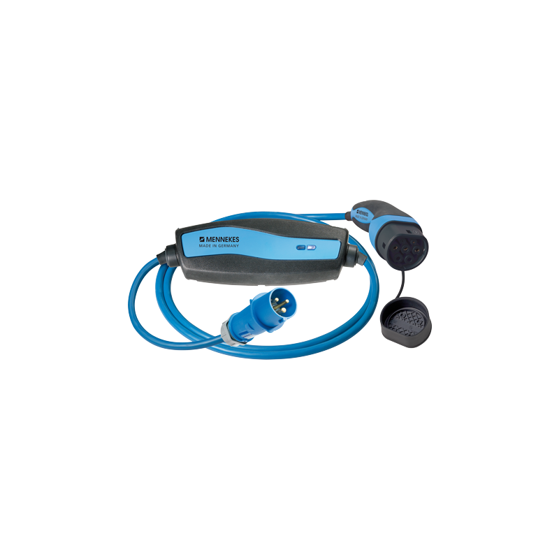CABLE DE RECHARGE MODE 2, PUISSANCE JUSQU'A 16A 230V MONOPHASE. AVEC CONNECTEUR TYPE 2 A LA COTE VOITURE ET FICHE CEE 16A3P230V BLEUE A LA COTE NET. LONGUEUR 8M