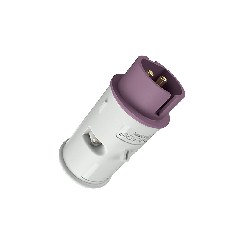 FICHE CEE 32A 2P 20-25V IP44.50-60 HZBORNES A VIS.ARRET DE TRACTION AVEC PROTECTION CONTRE PLIAGE.ENVELOPPE GRIS CLAIR, COULEUR CODIFIEE VIOLET.