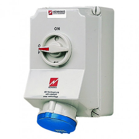 PRISE MURAL CEE 63A 3P 6H 230V IP44, AVEC INTERRUPTEUR ON/OFF.ET VERROUILLAGE MECANIQUE DUO.