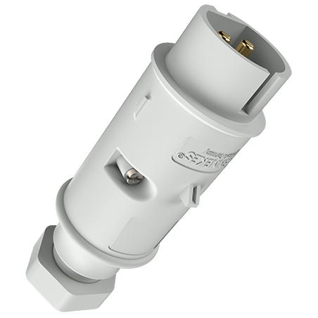 FICHE CEE 32A 2P 40-50V IP44.50-60 HZBORNES A VIS.PRESSE-ETOUPE AVEC JOINT.ARRET DE TRACTION AVEC PROTECTION CONTRE PLIAGE.ENVELOPPE GRIS CLAIR.