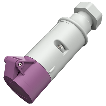 COUPLEUR CEE 16A 2P 20-25V IP44.50-60 HZBORNES A VIS.PRESSE-ETOUPE AVEC JOINT.ARRET DE TRACTION AVEC PROTECTION CONTRE PLIAGE.ENVELOPPE GRIS CLAIR, COULEUR CODIFIEE VIOLET.