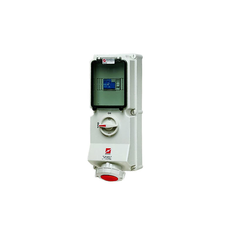 PRISE MURAL CEE 3A 5P 6H 400V IP67, AVEC INTERRUPTEUR ON/OFF.ET VERROUILLAGE MECANIQUE DUO.AVEC INTERRUPTEUR DIFFERENTIEL 0,03A.