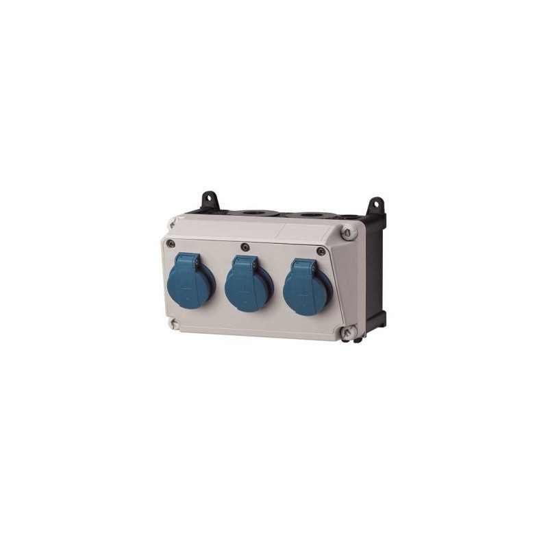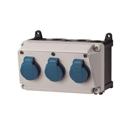 COMBINE DE PRISES DE COURANT AMAXX.COFFRET PLOMBABLE EN AMAPLAST, DIMENSIONS 130 X 225 MM (HAUTEUR X LARGEUR) ET AVEC UN DEGRE DE PROTECTION IP44.BASE NOIR ET COUVERCLE D'AVANT EN GRIS CLAIR FIXE AVEC DES VIS A DOUBLE FILETAGE.FIXATIONS INTERNES ET EXTERN