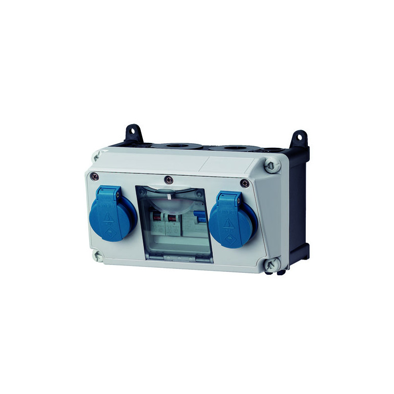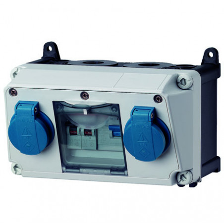 COMBINE DE PRISES DE COURANT AMAXX.COFFRET PLOMBABLE EN AMAPLAST, DIMENSIONS 130 X 225 MM (HAUTEUR X LARGEUR) ET AVEC UN DEGRE DE PROTECTION IP44.BASE NOIR ET COUVERCLE D'AVANT EN GRIS CLAIR FIXE AVEC DES VIS A DOUBLE FILETAGE.FIXATIONS INTERNES ET EXTERN