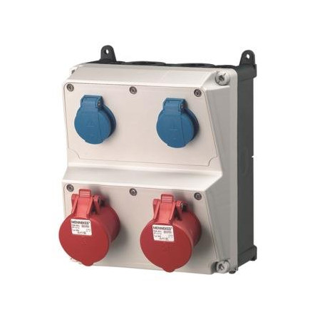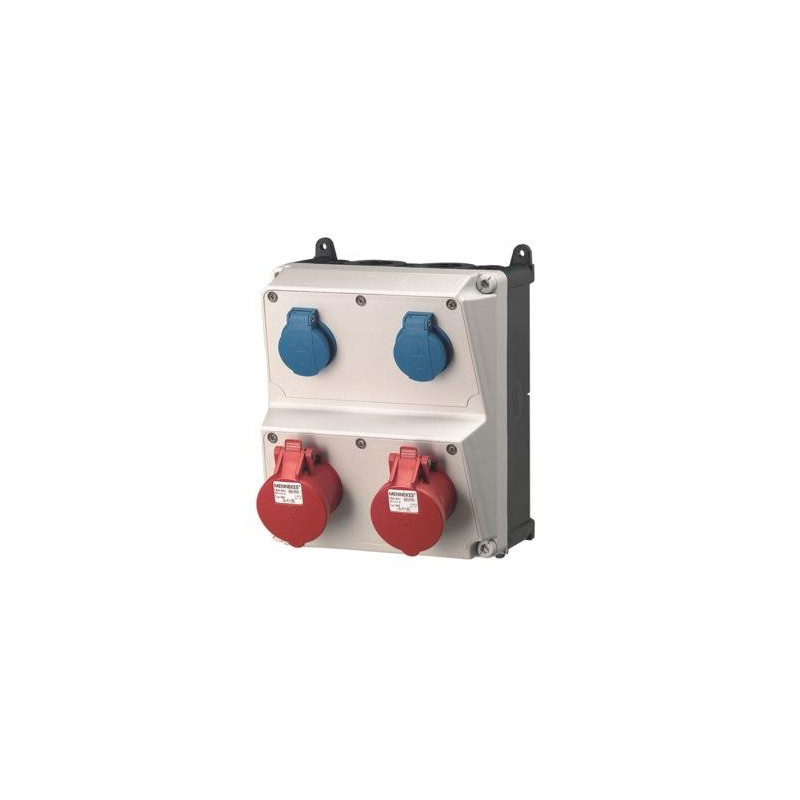 COMBINE DE PRISES DE COURANT AMAXX.COFFRET PLOMBABLE EN AMAPLAST, DIMENSIONS 260 X 225 MM (HAUTEUR X LARGEUR) ET AVEC UN DEGRE DE PROTECTION IP44.BASE NOIR ET COUVERCLE D'AVANT A CHARNIERE EN GRIS CLAIR FIXE AVEC DES VIS A DOUBLE FILETAGE.FIXATIONS INTERN