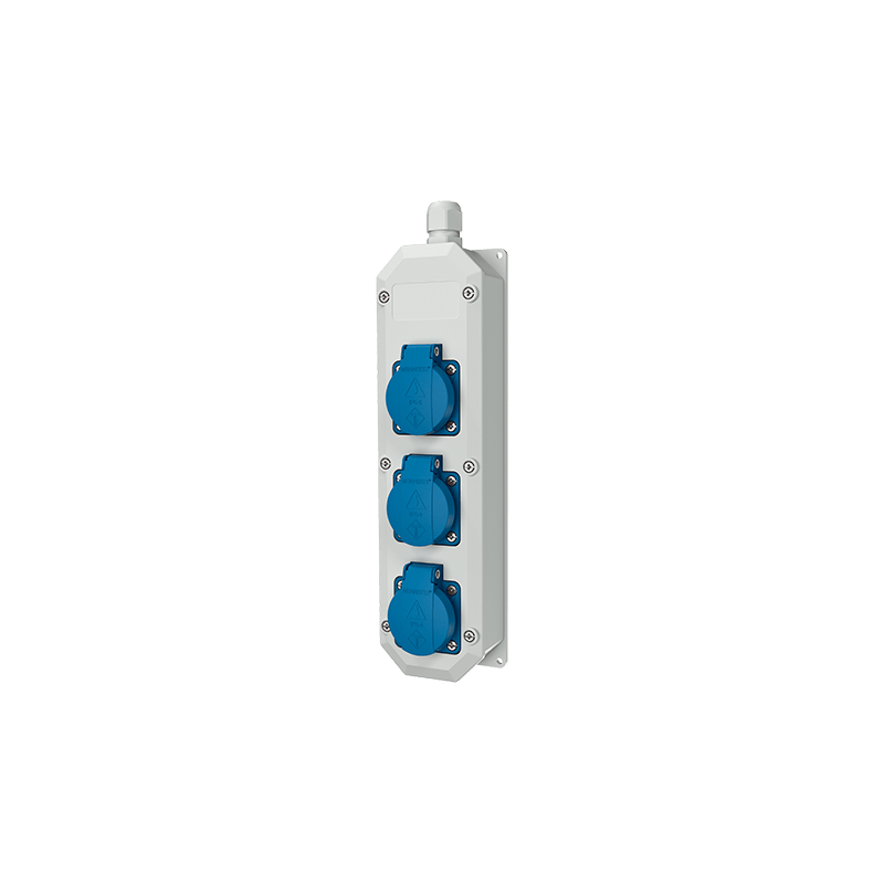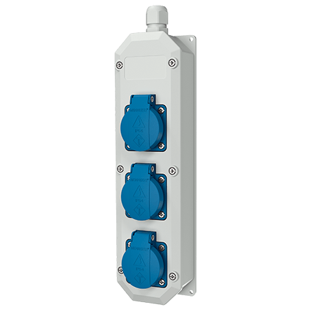REGLETTES DE PRISES DE COURANT IP44: NYLON, ROBUSTES, RESISTANTS AUX CHOCS, PRECABLEES AVEC BORNIER, PRESSE-ETOUPE, ARRET DE TRACTION. 3 PRISES DE COURANT 16A/230V 2P+A + SECURITE ENFANTS.