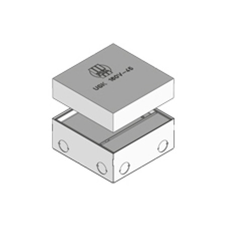 BOITE DE RACCORDEMENT CARREE COMPOSEE D'UNE BOITE DE CONSTRUCTION, UN COFFRAGE, UNE UNITE DE NIVELLEMENT, UN COUVERCLE AVEC SORTIE LATERALE ET UN JOINT EN CAOUTCHOUC.LA BOITE DE CONSTRUCTION AVEC OPERCULES DEFONCABLES EST FABRIQUEE EN TOLE D'ACIER. LE COR