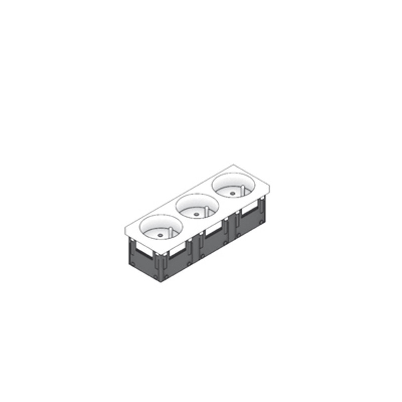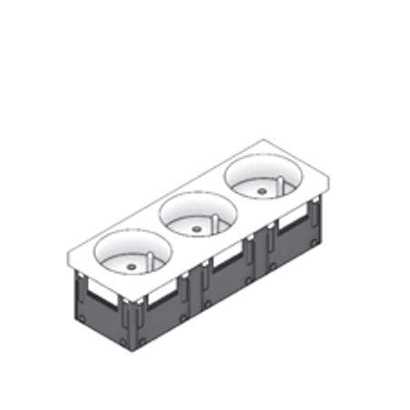 PRISE TRIPLE 10/16 A 250 V AC AVEC BROCHE DE TERRE. DIMENSIONS 135 X 45 MM, SENS D'INSERTION 33 , BORNES A RESORT, AVEC PROTECTION ENFANTS. COULEUR BLANC PUR (RAL 9010)