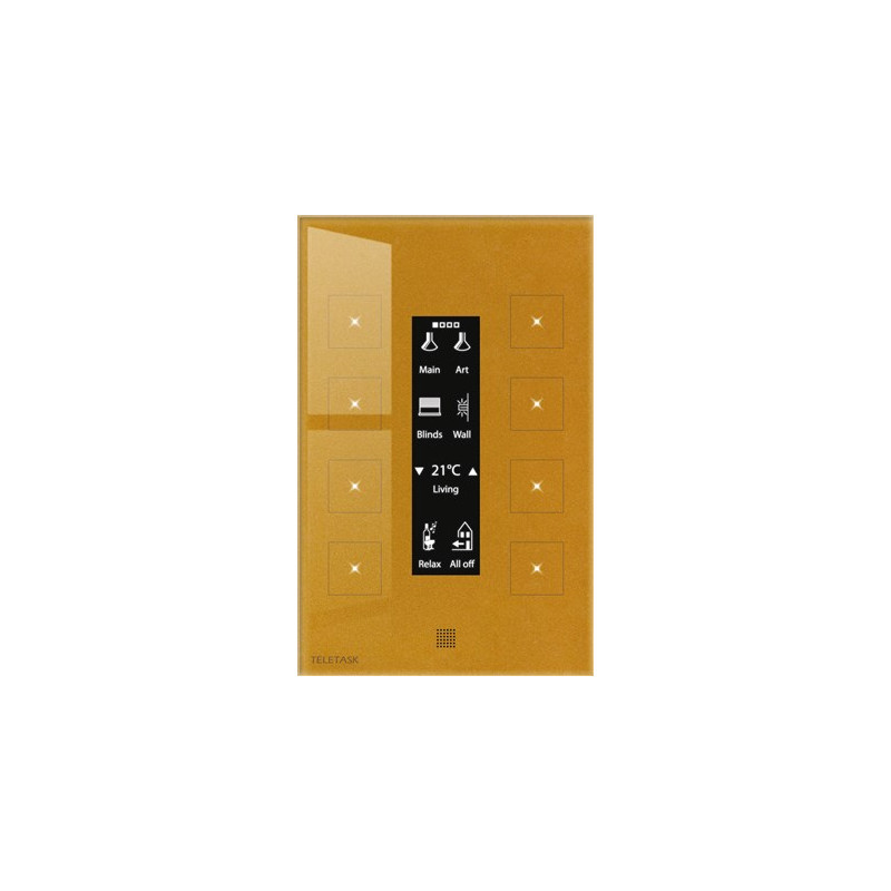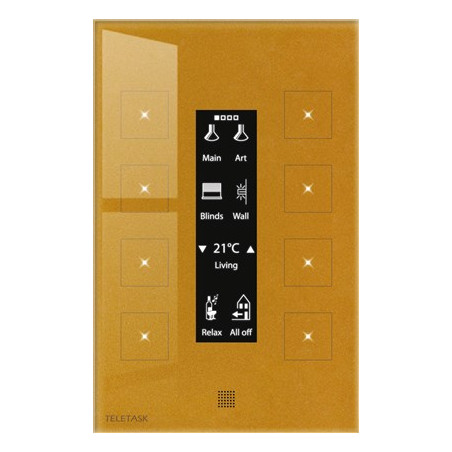 PANNEAU TACTILE EN VERRE - PERLE DOUCE (VERRE DE SECURITE AVEC UNE IMPRESSION CERAMIQUE DURCIE A 800 C) AVEC 8 BOUTONS. DISPLAY OLED CENTRAL AVEC SYMBOLES ET/OU TEXTE PAR BOUTON. 4 PAGES AVEC 8 FONCTIONS. MONTAGE VERTICAL OU HORIZONTAL.CHAQUE BOUTON A UN