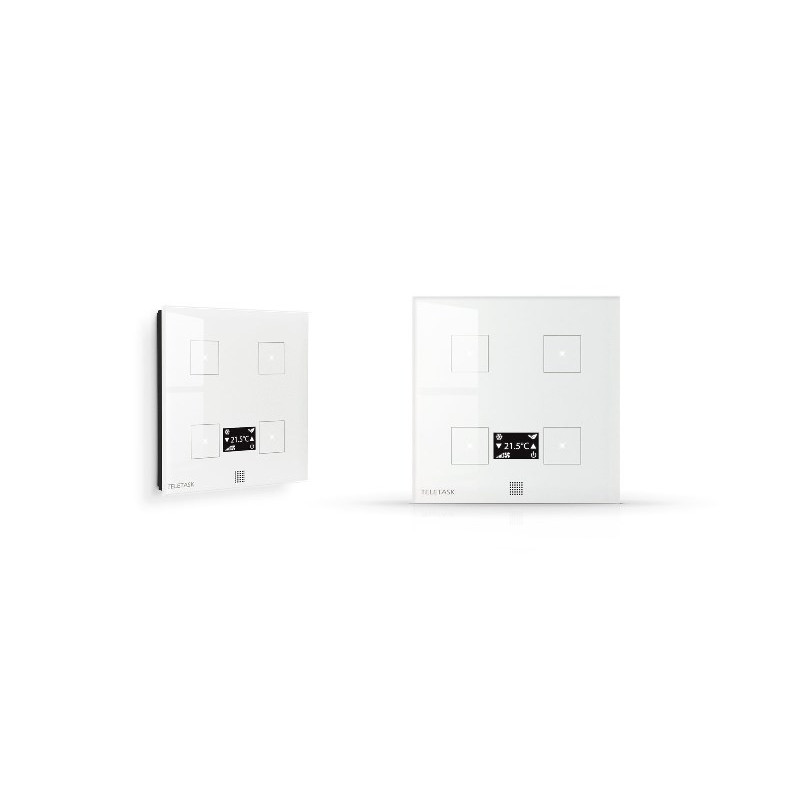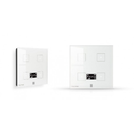 PANNEAU TACTILE EN VERRE - PERLE DOUCE (VERRE DE SECURITE AVEC UNE IMPRESSION CERAMIQUE DURCIE A 800 C) AVEC 4 BOUTONS. AVEC PETIT ECRAN OLED POUR LE CONTROLE DE LA TEMPERATURE DANS UNE PIECE.CHAQUE BOUTON A UN LED BLANC DE RETROACTION ET ECLAIRAGE NOCTUR