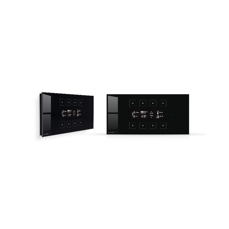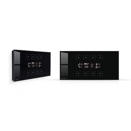 PANNEAU TACTILE EN VERRE - PERLE DOUCE VERRE DE SÉCURITÉ AVEC UNE IMPRESSION CÉRAMIQUE DURCIE À 800C AVEC 8 BOUTONS. DISPLAY OLED CENTRAL AVEC SYMBOLES ET/OU TEXTE PAR BOUTON. 4 PAGES AVEC 8 FONCTIONS. MONTAGE VERTICAL OU HORIZONTAL.CHAQUE BOUTON A UN