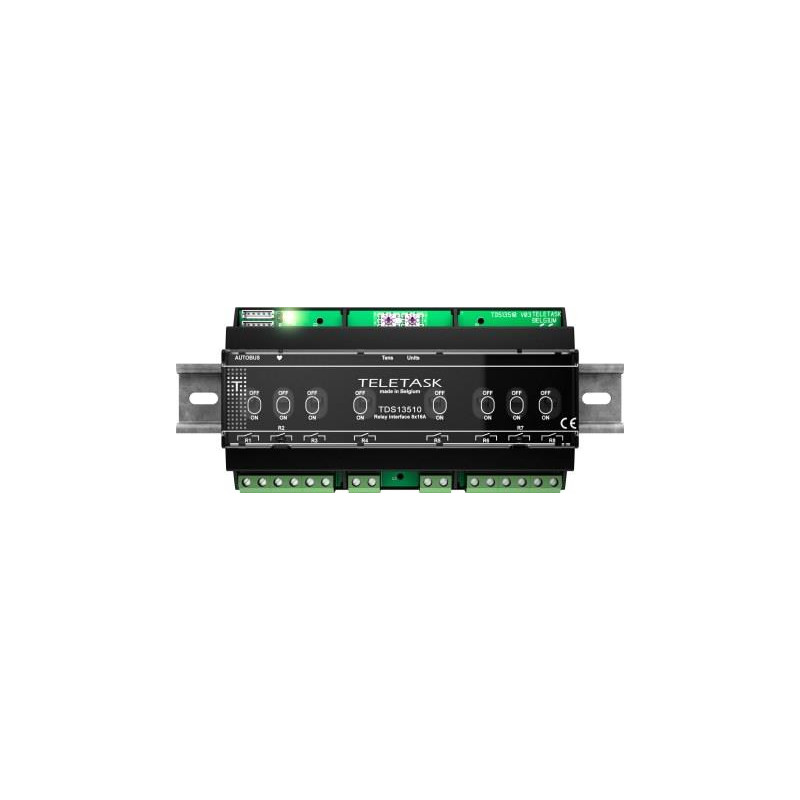 INTERFACE DE RELAIS AVEC 8 RELAIS DE PUISSANCE UNIPOLAIRES DE 16A/250V.CHAQUE RELAIS DISPOSE DE SA PROPRE COMMANDE MANUELLE. EN CAS DE PANNE DE COURANT, OU LORSQUE LA CENTRALE DOMOTIQUE EST ARRÊTÉE, LUTILISATEUR PEUT OUVRIR OU FERMER LE CONTACT DU RELAIS