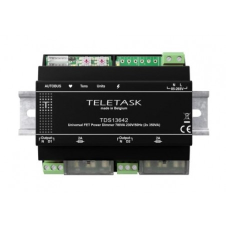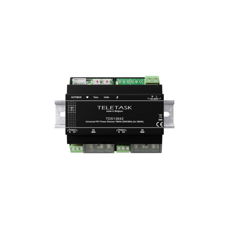 VARIATEUR DE PUISSANCE A DEUX CANAUX POUR LA COMMANDE A 230V/50HZ DES LAMPES TRADITIONNELLES, LED ET AUTRES ECLAIRAGES GRADABLES. LE VARIATEUR PEUT EGALEMENT COMMANDER DES LAMPES ET DES LED QUI SONT BRANCHEES SUR DES TRANSFORMATEURS TRADITIONNELS ET ELECT