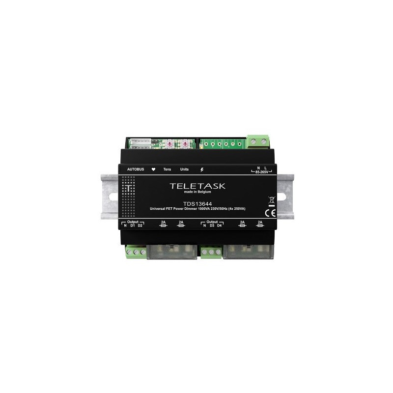 VARIATEUR DE PUISSANCE A QUATRE CANAUX POUR LA COMMANDE A 230V/50HZ DES LAMPES TRADITIONNELLES, LED ET AUTRES ECLAIRAGES GRADABLES. LE VARIATEUR PEUT EGALEMENT COMMANDER DES LAMPES ET DES LED QUI SONT BRANCHEES SUR DES TRANSFORMATEURS TRADITIONNELS ET ELE