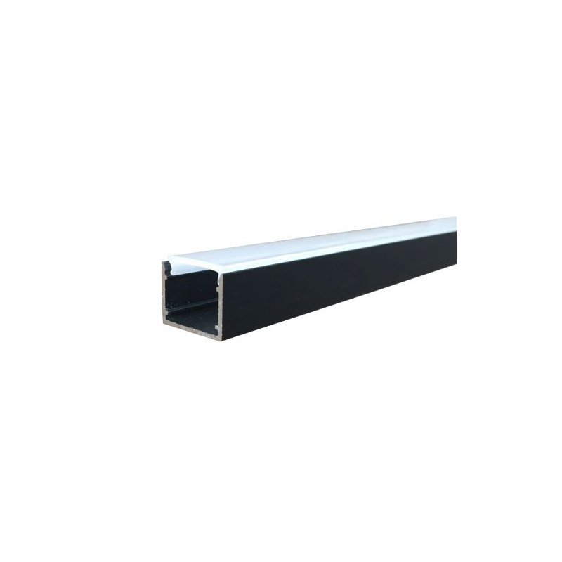 Profile led Baseline en aluminium anodisé AL6063 laqué noir. Kit complet avec profil led et couvercle opalin en polycarbonate, 4 embouts 2 avec entrée de câble et 4 supports de montage dans un tube en carton pratique et robuste. Longueur 2 mètres, largeur 17 mm et hauteur 15 mm. Capacité de refroidissement jusquà 15W par mètre.