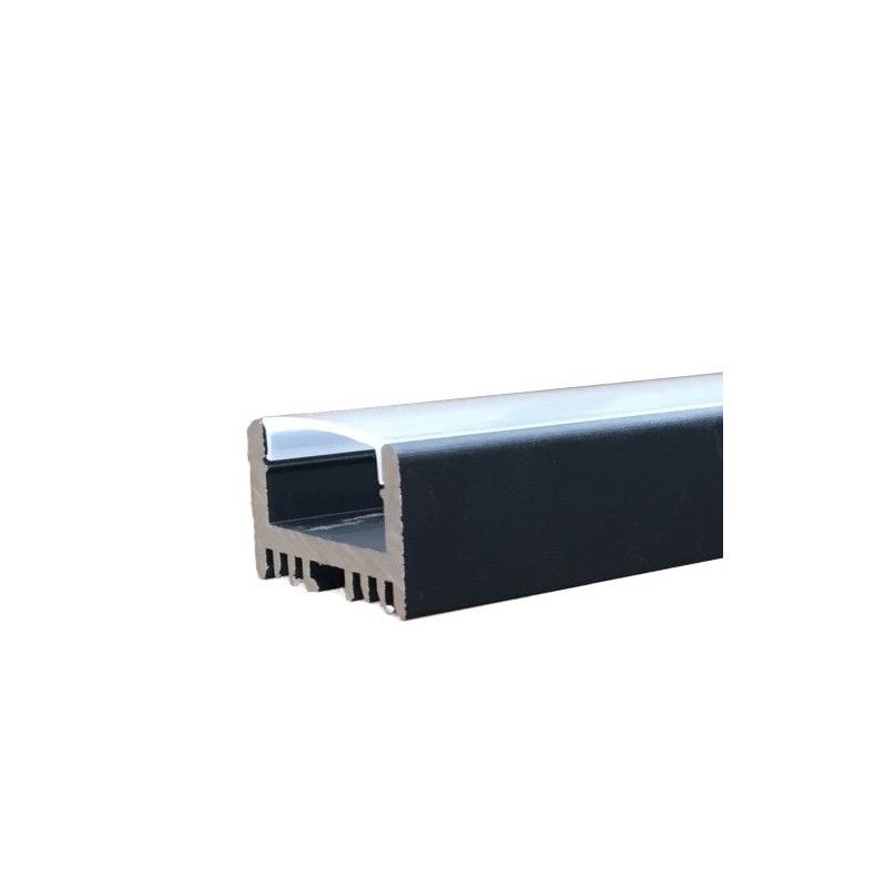 Profile led Baseline en aluminium anodisé AL6063 laqué noir. Kit complet avec profil led et couvercle opalin en polycarbonate, 4 embouts 2 avec entrée de câble et 4 supports de montage dans un tube en carton pratique et robuste. Longueur 2 mètres, largeur 26 mm et hauteur 17 mm. Capacité de refroidissement jusquà 25W par mètre.
