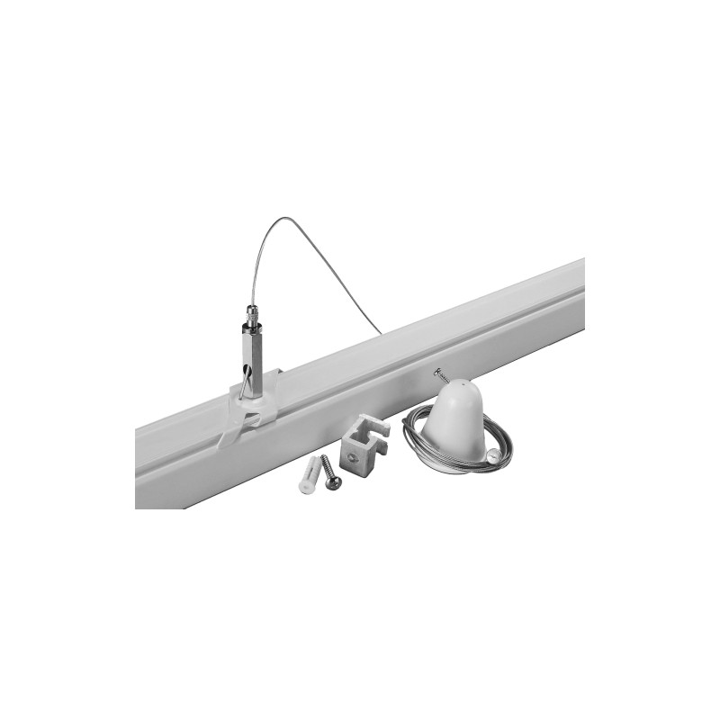 Suspension avec fil dacier longueur de 3m pour rail triphasé blanc. Inclut clip pour fil acier et bouchon de finition.