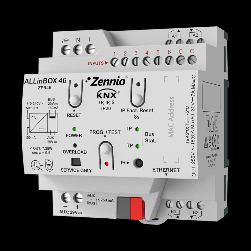 Description: Alimentation KNX 160mAInterface KNX-IP (jusqu'à 5 connexions)Longueur maximale de l'APDU de 254 octetsTéléchargement rapide grâce à une connexion IP directe4 sorties configurées comme sorties individuelles, canaux d'obturateur ou contrleur de ventilo-convecteur (16 A C-load)6 entrées pour boutons poussoirs, capteurs de température (ZN1AC-NTC68) ou détecteurs de mouvement (ZEZPDEZINA/ZEZPDEZINW)Fonctionnement manuel avec télécommande IR (non incluse)4 contrleurs climatiques PIContrle de scène20 fonctions log