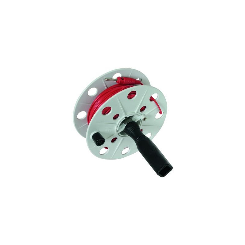 ENROULEUR DE CÂBLE LARGEUR 40 MM AVEC POIGNÉE ET 50 M DE CÂBLE DE MESURE ROUGE AVEC FICHE BANANE.