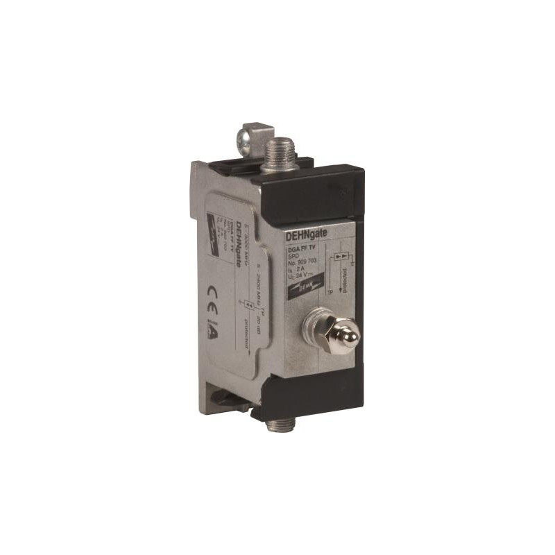DEHNGATE FF TV. PARASURTENSION POUR SYSTÈMES COAXIAUX 75 OHM POUR MONTAGE SUR RAIL SIGNAUX TV, SAT,....PROTECTION SELON EN61643-21. AVEC SORTIE DE MESURE INTÉGRÉE POUR LE CONTROLE DE LINSTALLATION. A INSTALLER AU PASSAGE À LA ZONE DE PROTECTION 1 À 2 .