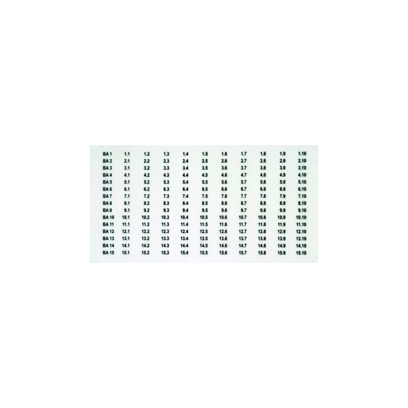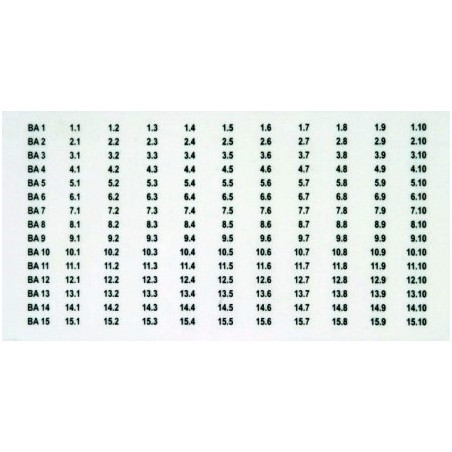 2 X 165 ETIQUETTES AUTOCOLLANTES POUR LE REPERAGE DES MODULES DE SURVEILLANCE DRC MCM XT (DE BA1 A BA15) AVEC L'ADRESSE BUS ET LE NUMERO DES MODULES DE PROTECTION BXT/BXTU OU DES EMBASES (DE 1.1 - 1.10 A 15.1 - 15.10).