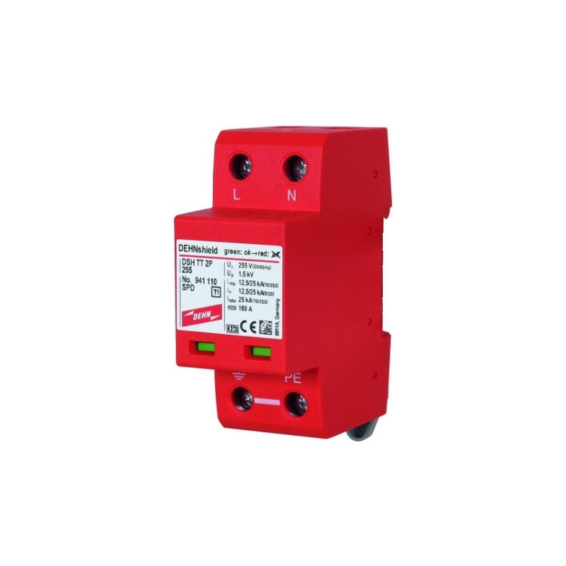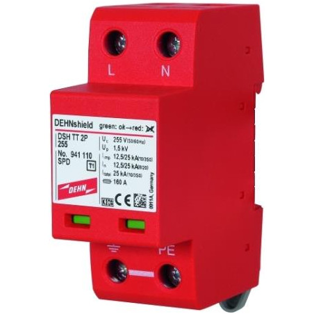 DEHNSHIELD TT 2P 255 PARAFOUDRE-PARASURTENSION COMPACT COMBINE MODULAIRE UNIPOLAIRE POUR RESEAUX TT OU TNS (SCHEMA '1+1'). TYPE 1 SELON EN61643-11. CAPACITE D'ECOULEMENT 25KA(10/350). NIVEAU DE PROTECTION: < 1,5KV. MODULE AVEC HAUTE CAPACITE D'EXTINCTION