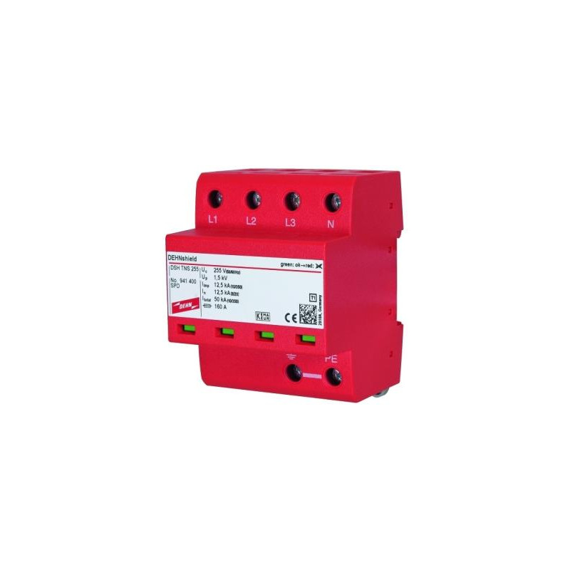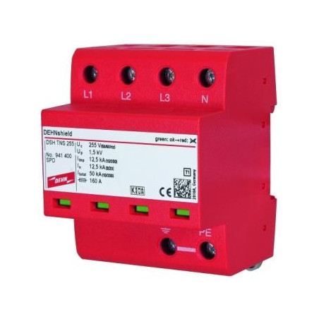 DEHNSHIELD TNS 255 PARAFOUDRE-PARASURTENSION COMPACT COMBINE MODULAIRE TETRAPOLAIRE POUR RESEAUX TNS. TYPE 1 SELON 61643-11. CAPACITE D'ECOULEMENT 50KA(10/350). NIVEAU DE PROTECTION: < 1,5KV. MODULE AVEC HAUTE CAPACITE D'EXTINCTION DU COURANT DE SUITE.